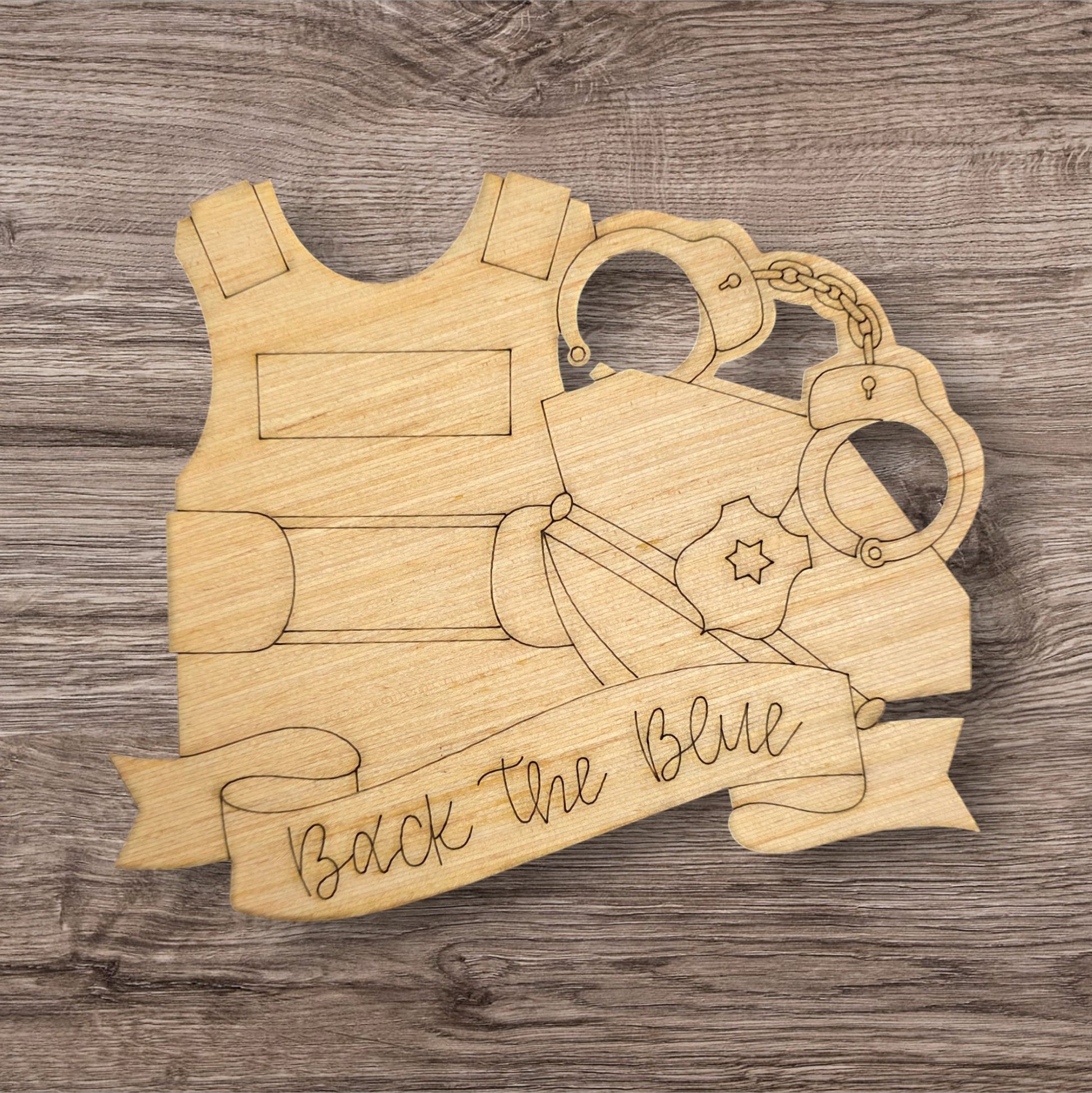 This unfinished law-enforcement-themed blank with etched design is ready for your creative touch. Decorate it with blues, blacks, and other colors that represent the dedication of police officers. The durable 1/4" plywood is sturdy for hanging and showcases natural wood grain variations.