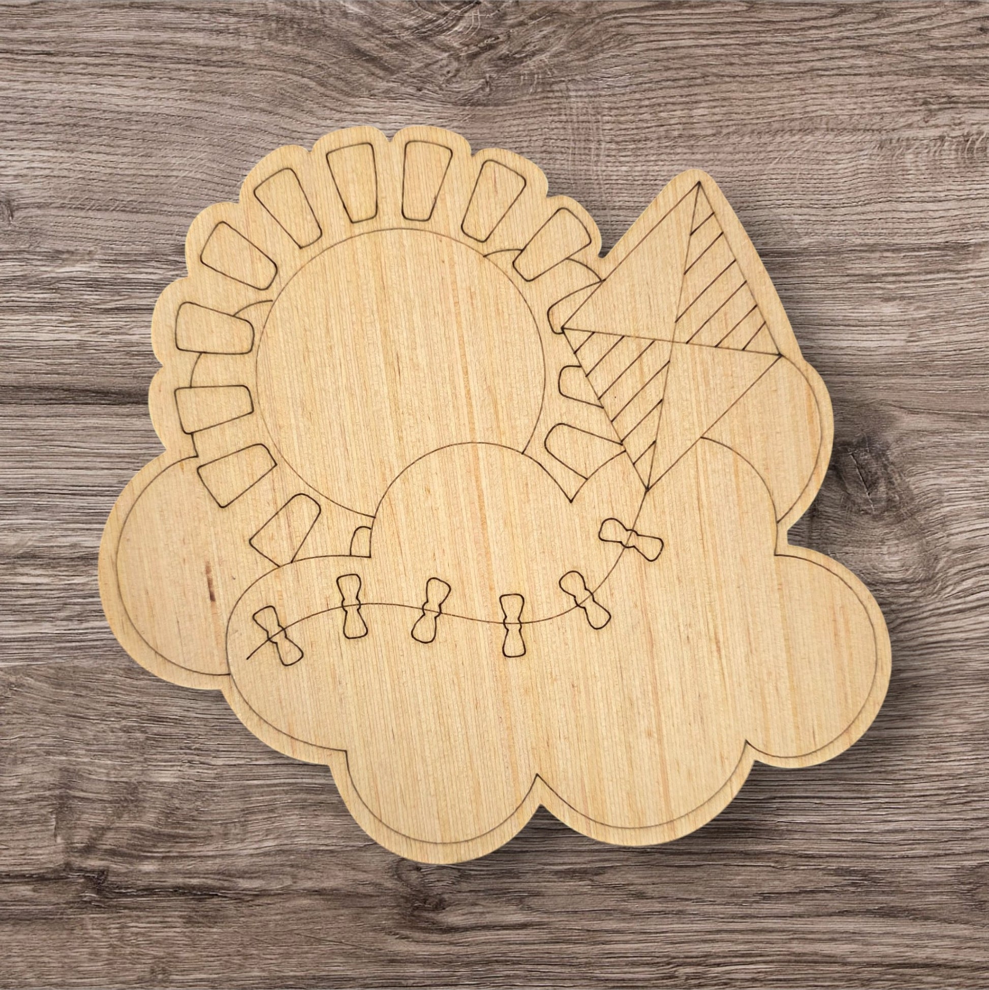 Let your creativity soar with our bright Kite Sunshine wood blank from Grayson & Me! This cheerful wooden cutout features a classic kite shape combined with delightful sunshine design elements laser-etched directly into the high-quality 1/4" plywood. The etched lines provide excellent guides for your DIY painting projects.