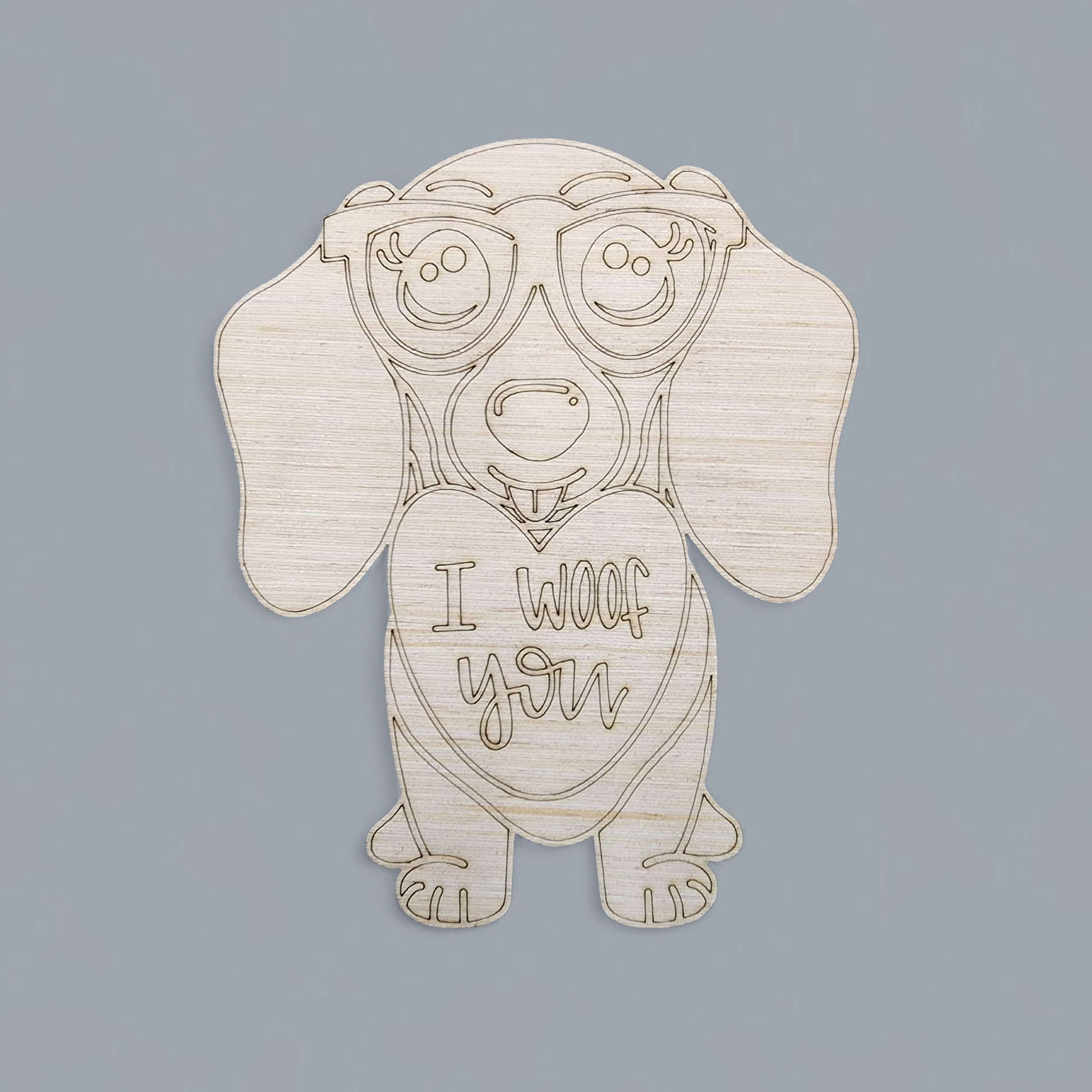 Say "I love you" in the most adorable way possible with our "I Woof You" Dachshund Door Hanger from MJ's Signs! This charming wood cutout features a detailed, engraved design of a Dachshund in heart-shaped sunglasses, holding a special message. The clear lines make it a fun and easy "paint-by-line" project to create a heartfelt gift or a lovely piece of seasonal decor.